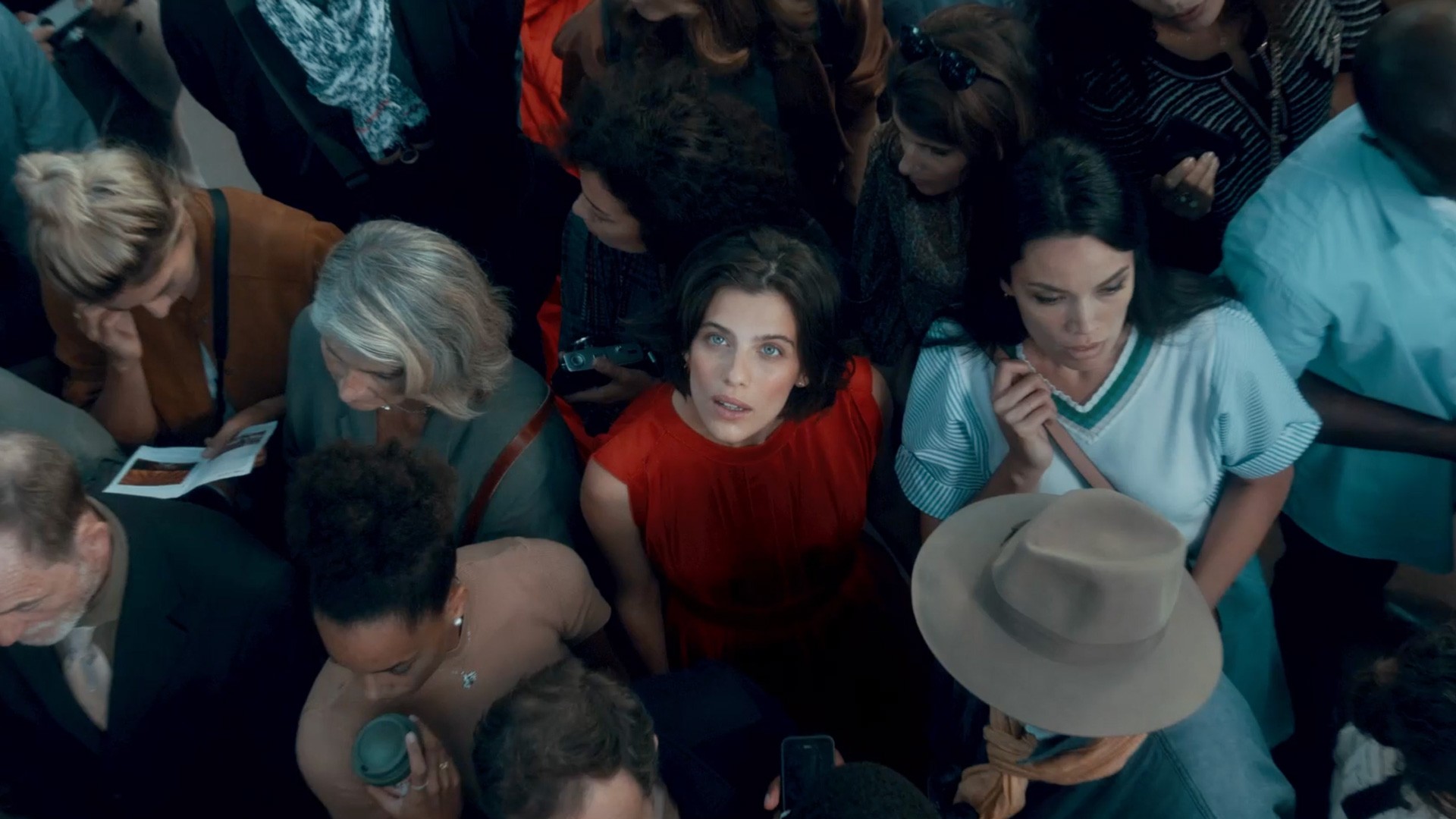 Una donna in abito rosso con uno strascico interminabile sale la Torre Eiffel, scalino dopo scalino, con grazia e leggerezza. Non è una passeggera: è un'allegoria della compagnia e della Francia stessa.